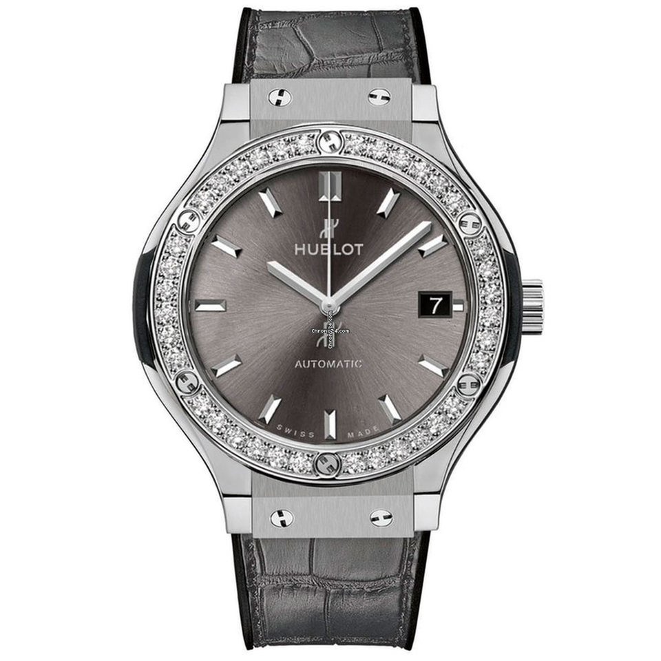Grey titanium case with a grey (alligator) leather strap. Fixed grey titanium set with diamonds bezel. Grey sandblast dial with silver-tone hands and index hour markers. Dial Type: Analog. Date display at the 3 o'clock position. Hublot caliber HUB1110 automatic movement, based upon Sellita SW300-1, containing 25 Jewels, bitting at 28800 vph, and has a power reserve of approximately 42 hours. Scratch resistant sapphire crystal. Pull / push crown. Transparent case back. Round case shape. Case size: 42 mm. Fold over clasp with a safety release. Water resistant at 50 meters / 165 feet. Functions: date, hour, minute, second. Additional Info: bezel set with 36 diamonds approx 0.75 ct. Classic Fusion Racing Grey Series. Luxury watch style. Watch label: Swiss Made. Hublot Classic Fusion Racing Grey Automatic Diamond Grey Sunblast Dial Mens Watch 542.NX.7071.LR.1104.