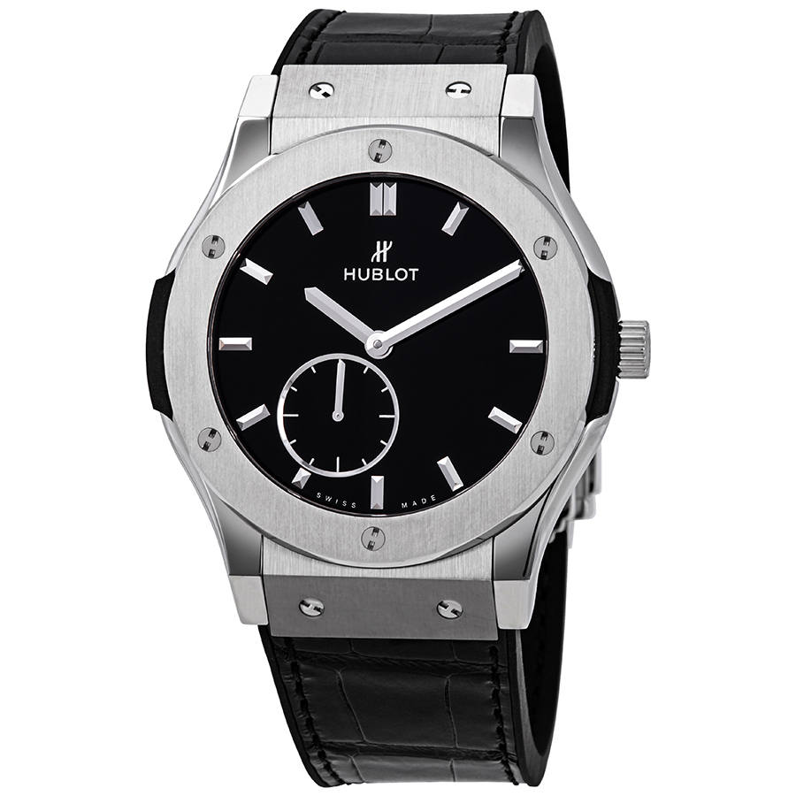 Grey titanium case with a rubber strap with a black (alligator) leather inlay. Fixed titanium grey bezel The bezel is set on a black resin ring (lugs). Black dial with silver-tone hands and index hour markers. Dial Type: Analog. Small seconds sub-dial at the 7 o'clock position. Hublot calibre HUB1300 hand wind movement, containing 23 Jewels, composed of 123 parts, bitting at 21600 vph, and has a power reserve of approximately 90 hours. Scratch resistant sapphire crystal. Pull / push crown. Transparent case back. Round case shape. Case size: 42 mm. Deployment clasp with a push button release. Water resistant at 50 meters / 165 feet. Functions: hour, minute, second. Luxury watch style. Watch label: Swiss Made. Item Variations: 545 NX 1270 LR, 545-NX-1270-LR, 545/NX/1270/LR, 545NX1270LR. Hublot Classic Fusion Ultra Thin Titanium Automatic Black Dial Mens Watch 545.NX.1270.LR.