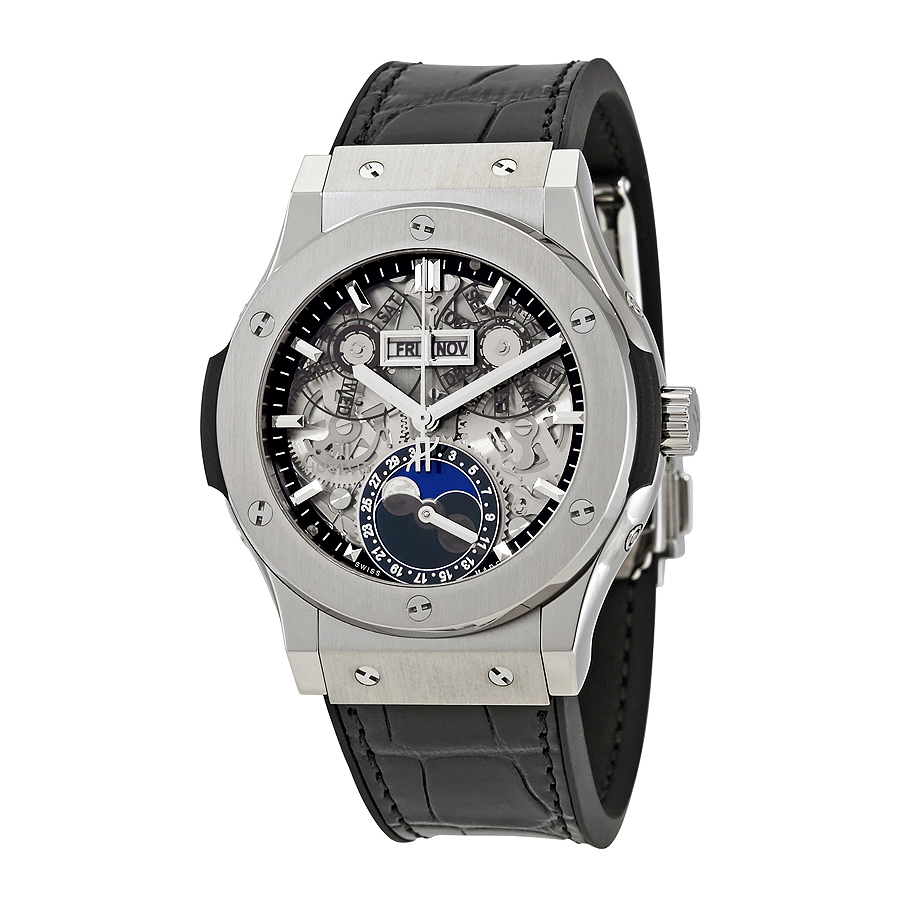 Grey titanium case with a black leather strap. Fixed grey titanium bezel. Skeleton dial with silver-tone hands and index hour markers. Minute markers around the outer rim. Dial Type: Analog. Date display at the 6 o'clock position. Three sub-dials displaying: month, day, date/moonphase. Hublot Calibre HUB1131 Automatic movement, containing 25 Jewels, composed of 134 parts, bitting at 28800 vph, and has a power reserve of approximately 42 hours. Scratch resistant sapphire crystal. Pull / push crown. Transparent case back. Round case shape, case size: 42 mm. Fold over with push button release clasp. Water resistant at 50 meters / 165 feet. Functions: moon phase, month, date, day, hour, minute, second. Classic Fusion Aerofusion Series. Luxury watch style. Watch label: Swiss Made. Hublot Classic Fusion Aerofusion Moonphase Automatic Mens Watch 547.NX.0170.LR.