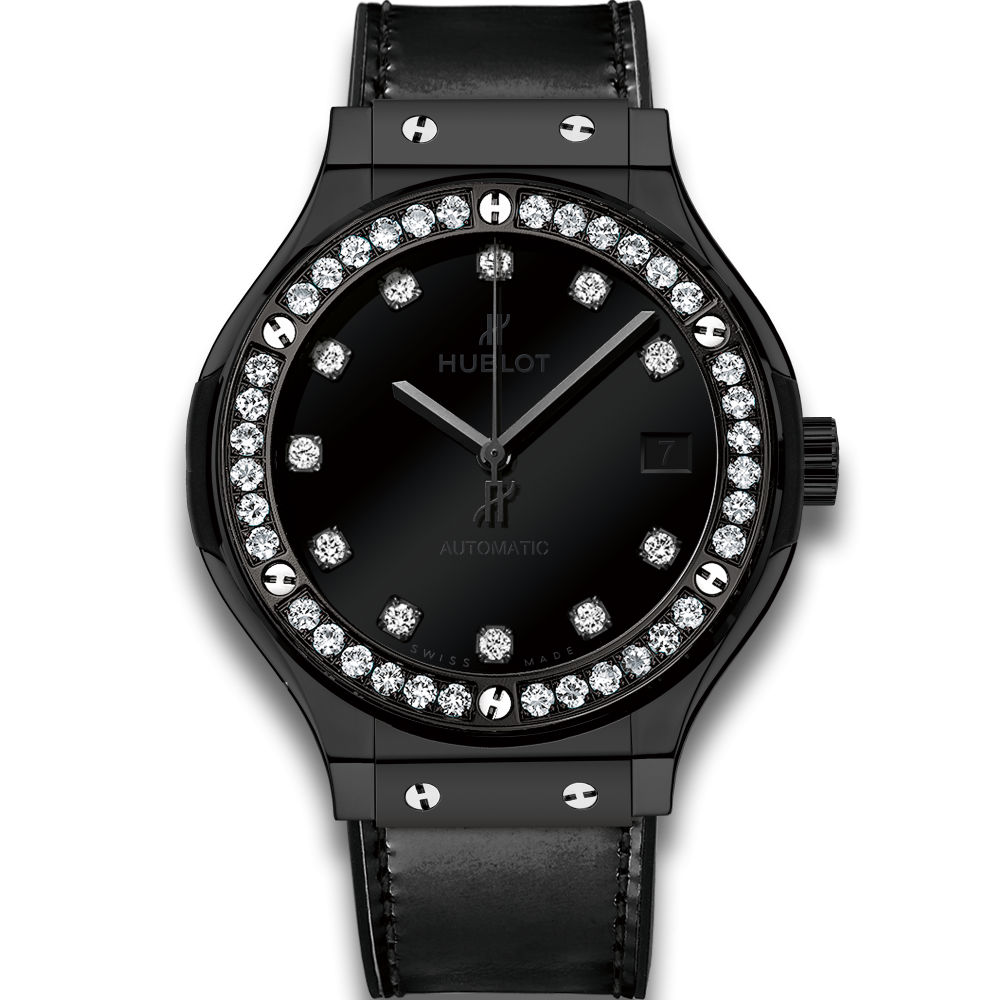 Black ceramic case with a alligator outer / rubber inner strap. Fixed bezel. Lacquered black dial with black hands and diamonds hour markers. Dial Type: Analog. Date display at the 3 o'clock position. Automatic movement. Hub1110 engine. Scratch resistant sapphire crystal. Pull / push crown. Skeleton transparent exhibition see through case back. Case diameter: 38 mm. Round case shape. Deployment with push button clasp. Water resistant at 50 meters / 165 feet. Functions: date, hour, minute, second. Additional Info: bezel set with 36 diamonds (1.16 cts). Luxury watch style. Watch label: Swiss Made. Item Variations: 565 CX 1210 VR 1204, 565-CX-1210-VR-1204, 565/CX/1210/VR/1204, 565CX1210VR1204. Hublot Classic Fusion Lacquered Black Dial Automatic Mens Diamond Watch 565.CX.1210.VR.1204.