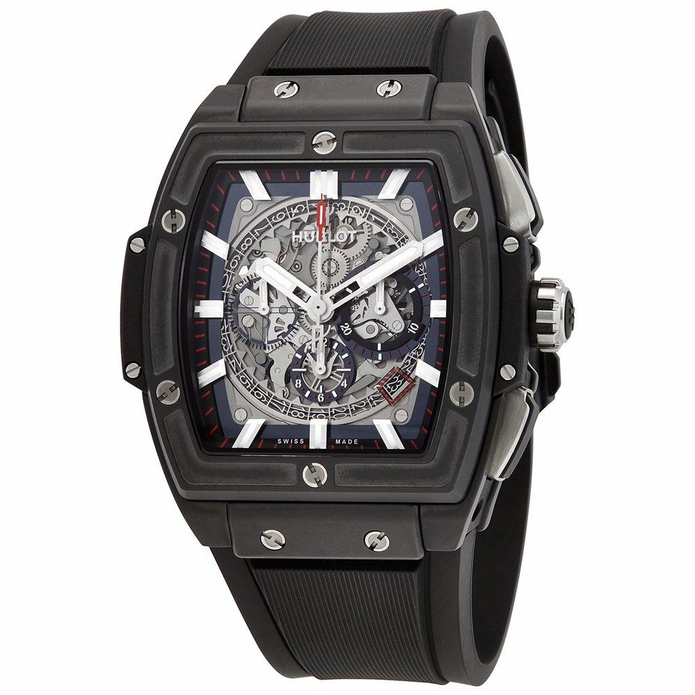 Black ceramic case with a black (structured lined) rubber strap. Fixed black ceramic bezel. Silver skeleton dial with luminous silver-tone hands and index hour markers. Minute markers around the outer rim. Dial Type: Analog. Luminescent hands and markers. Date display between the 4 and 5 o'clock positions. Chronograph - three sub-dials displaying: 60 second, 30 minute and 12-hour. Hublot Calibre HUB4700 Automatic movement, bitting at 36000 vph, and has a power reserve of approximately 50 hours. Scratch resistant sapphire crystal. Pull / push crown. Transparent case back. Tonneau case shape, case size: 51 mm x 45 mm. Black-plated titanium deployant clasp. Water resistant at 50 meters / 165 feet. Functions: chronograph, date, hour, minute, second. Spirit Of Big Bang Series. Luxury watch style. Watch label: Swiss Made. Hublot Spirit of Big Bang Chronograph Automatic Mens Watch 601.CI.0173.RX.