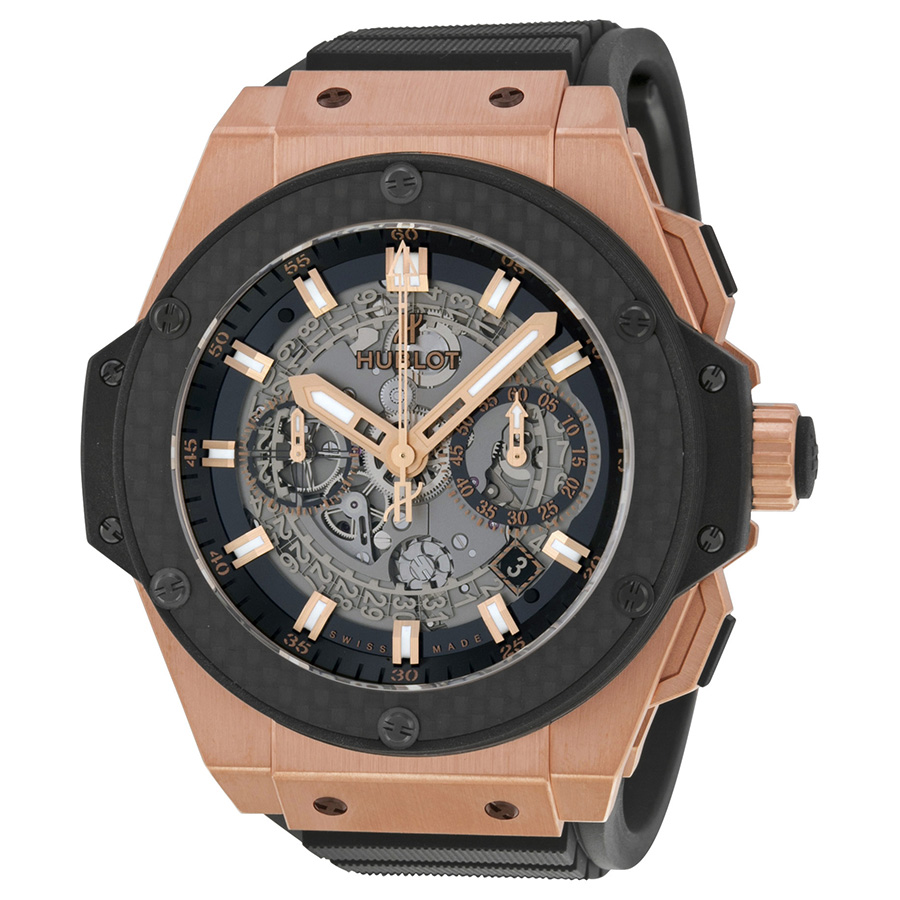 18kt rose gold case with a black rubber strap. Fixed carbon fiber bezel. Skeleton dial with luminous hands and index hour markers. Minute markers around the outer rim. Dial Type: Analog. Date display between 4 and 5 o'clock position. Chronograph - two sub-dials displaying: 60 second and 60 minute. Automatic movement with a 70 power reserve. Scratch resistant sapphire crystal. Screw down crown. Skeleton case back. Case diameter: 48 mm. Case thickness: 17.60 mm. Round case shape. Deployment clasp. Water resistant at 100 meters / 330 feet. Functions: chronograph, date, hour, minute, second. Luxury watch style. Watch label: Swiss Made. Hublot King Power Unico Black Dial King Gold Automatic Mens Watch 701OQ0180RX.