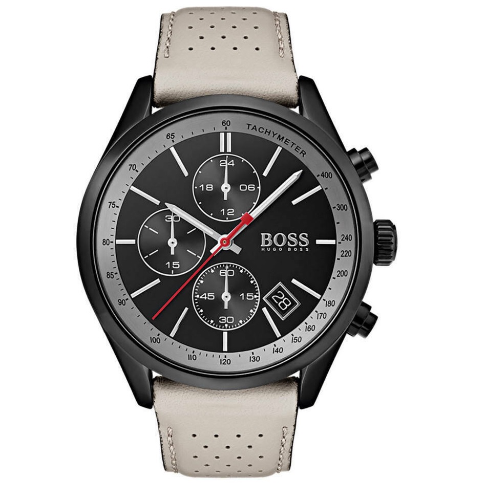 Black PVD stainless steel case with a beige leather strap. Fixed black PVD bezel. Black dial with silver-tone hands and index hour markers. Tachymeter markers around the outer rim. Dial Type: Analog. Date display between the 4 and 5 o'clock positions. Chronograph - three sub-dials displaying: 60 second, 30 minute and 24 hour. Quartz movement. Scratch resistant mineral crystal. Solid case back. Round case shape. Case size: 44 mm. Case thickness: 10 mm. Band width: 20 mm. Tang clasp. Water resistant at 30 meters / 100 feet. Functions: chronograph, tachymeter, date, hour, minute, second. Casual watch style. Hugo Boss Chronograph Quartz Black Dial Mens Watch 2944472.