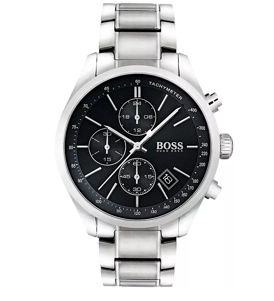 Stainless steel case with a stainless steel bracelet. Fixed stainless steel bezel. Black dial with silver-tone hands and index hour markers. Tachymeter markers around the outer rim. Dial Type: Analog. Date display between the 4 and 5 o'clock positions. Chronograph - three sub-dials displaying: 60 second, 30 minute and 24 hour. Quartz movement. Scratch resistant mineral crystal. Pull / push crown. Solid case back. Round case shape. Case size: 44 mm. Band width: 22 mm. Fold over clasp with a safety release. Water resistant at 30 meters / 100 feet. Functions: chronograph, date, hour, minute, second. Grand Prix Series. Dress watch style. Hugo Boss Grand Prix Chronograph Quartz Black Dial Mens Watch 2778636.