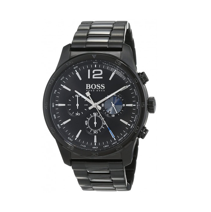 Black ion-plated stainless steel case and bracelet. Fixed black ion-plated bezel. Black dial with luminous silver-tone hands and index hour markers. An Arabic numeral marker appears at the 12 o'clock position. Minute markers. Tachymeter markings around the outer rim. Dial Type: Analog. Luminescent hands. Chronograph - three sub-dials displaying: 60 second, 60 minute and 24 hour. Quartz movement. Scratch resistant sapphire crystal. Pull / push crown. Solid case back. Round case shape. Case size: 42 mm. Case thickness: 6.5 mm. Band width: 22 mm. Fold over clasp with a safety release. Water resistant at 30 meters / 100 feet. Functions: chronograph, tachymeter, hour, minute, second. Professional Series. Casual watch style. Hugo Boss Professional Chronograph Quartz Black Dial Mens Watch 1513528.