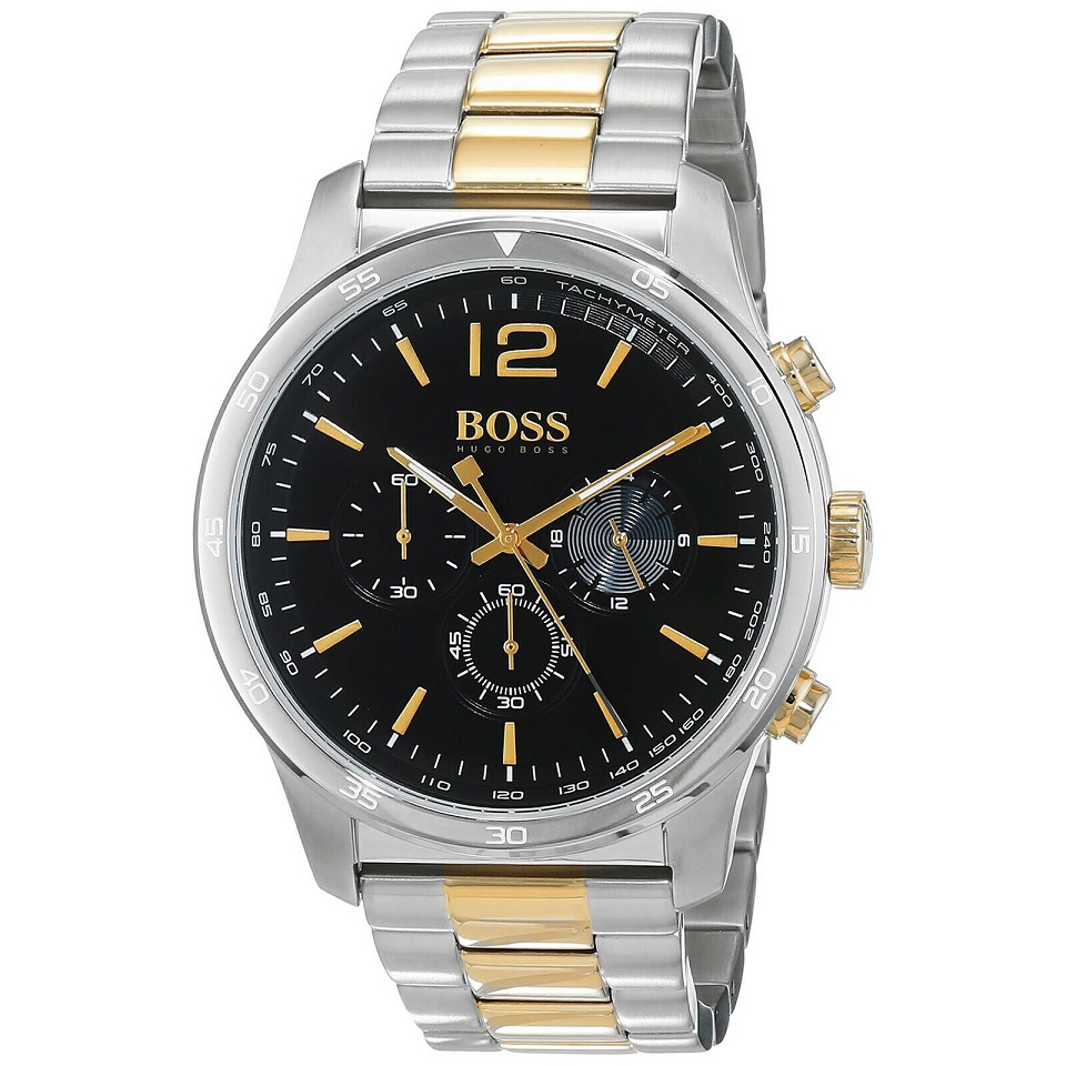 Stainless steel case with a two-tone (silver-tone and gold-tone) stainless steel bracelet. Fixed stainless steel bezel. Black dial with luminous gold-tone hands and index hour markers. An Arabic numeral appears at the 12 o'clock positions. Minute markers. Tachymeter markings around the outer rim. Dial Type: Analog. Luminescent hands. Chronograph - three sub-dials displaying: 60 second, 60 minute and 24 hour. Quartz movement. Scratch resistant sapphire crystal. Pull / push crown. Solid case back. Round case shape. Case size: 42 mm. Case thickness: 6.5 mm. Band width: 22 mm. Fold over clasp with a safety release. Water resistant at 50 meters / 165 feet. Functions: chronograph, tachymeter, hour, minute, second. Professional Series. Sport watch style. Hugo Boss Professional Chronograph Quartz Black Dial Mens Watch 3062281.