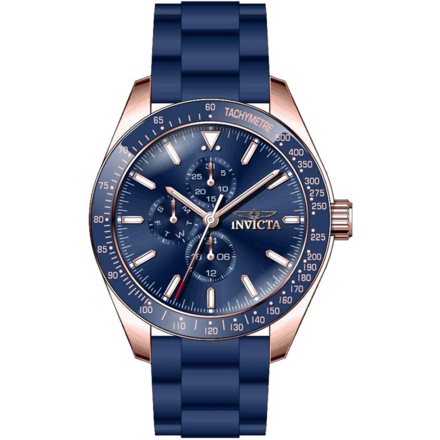 Rose gold-tone stainless steel case with a blue silicone strap. Fixed rose gold-tone bezel with an inlaid blue ring showing tachymeter markings. Blue dial with luminous rose gold-tone hands and index hour markers. Minute markers around the outer rim. Dial Type: Analog. Luminescent hands and markers. Three multi-function sub-dials displaying: date, day of the week and 24 hour. TMI caliber VH67 quartz movement. Scratch resistant Flame Fusion crystal. Pull / push crown. Solid case back. Round case shape. Case size: 45 mm. Case thickness: 12 mm. Band width: 22 mm. Band length: 8.25 inches. Tang clasp. Water resistant at 100 meters / 330 feet. Functions: date, day, GMT, tachymeter, second time zone, hour, minute, second. Aviator Series. Casual watch style. Watch label: Japan Movt. Invicta Aviator GMT Blue Dial Blue Silicone Mens Watch 38406.