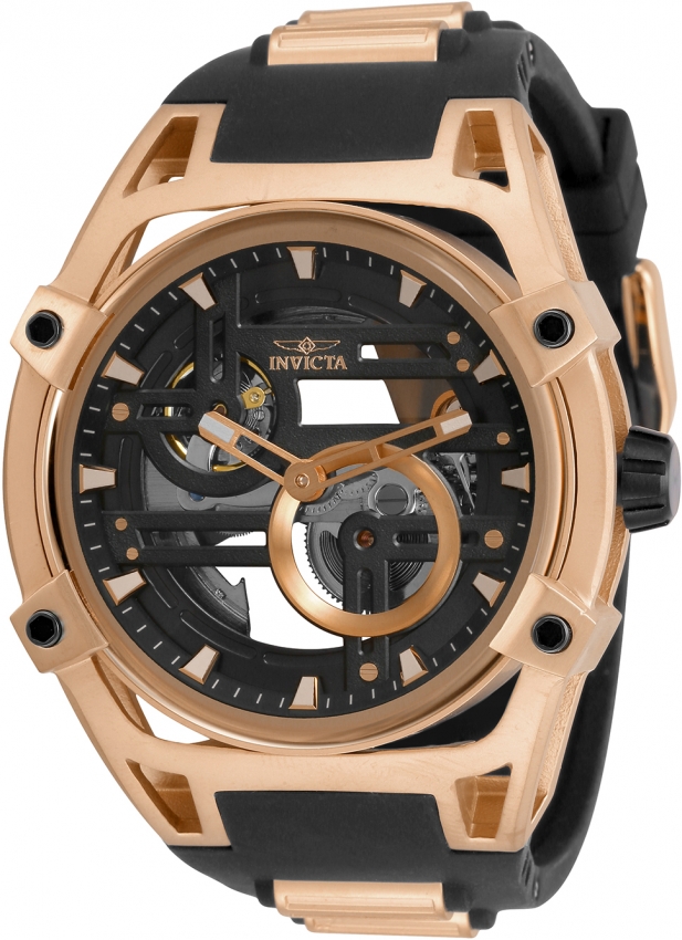 Rose gold-tone stainless steel case with a two-tone (black and rose gold-tone) silicone and stainless steel strap. Fixed rose gold and gunmetal stainless steel bezel. Black dial with rose gold-tone hands and index hour markers. Minute markers around the outer rim. Dial Type: Analog. Luminescent hands and markers. Caliber LG0806 automatic movement. Scratch resistant Flame Fusion crystal. Pull / push crown. Transparent see through case back. Round case shape, case size: 52 mm. Band width: 30 mm, band length: 8.25 inches. Buckle clasp. Water resistant at 100 meters / 330 feet. Functions: hour, minute. Akula Series. Dress watch style. Invicta Akula Automatic Black Dial Mens Watch 32351.