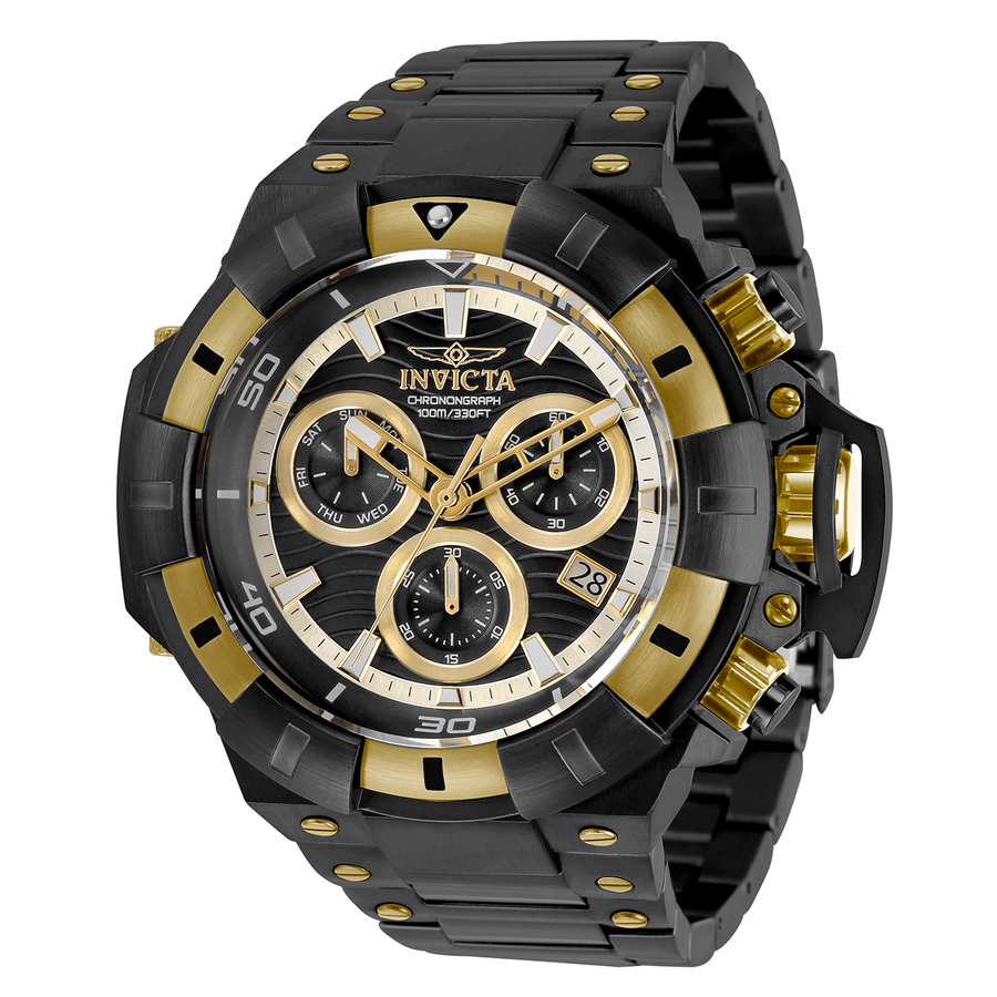 The vast power of the Akula claims notoriety. This professional Swiss made master is armed with impenetrable casing and a shock resistance of 28.8000vph. The Akula forged its mighty way forward loaded with the capacity and looks to fully submerge into the depths and caverns of time. Black stainless steel case with a two-tone (black and gold-tone) stainless steel bracelet. Fixed two-tone (black and gold-tone) stainless steel bezel. Black dial with gold-tone hands and index hour markers. Minute markers around the outer rim. Dial Type: Analog. Luminescent hands and markers. Date display at the 4 o'clock position. Three sub-dials displaying: day, 60 second and 30 minute. Ronda Caliber Z60 FE quartz movement. Scratch resistant Flame Fusion crystal. Pull / push crown. Solid case back. Round case shape, case size: 52.5 mm, case thickness: 11 mm. Band width: 30 mm, band length: 8.25 inches. Fold over clasp. Water resistant at 100 meters / 330 feet. Functions: chronograph, date, day, hour, minute, second. Akula Series. Sport watch style. Watch label: Swiss Movt. Invicta Akula Chronograph Quartz Black Dial Mens Watch 31870.