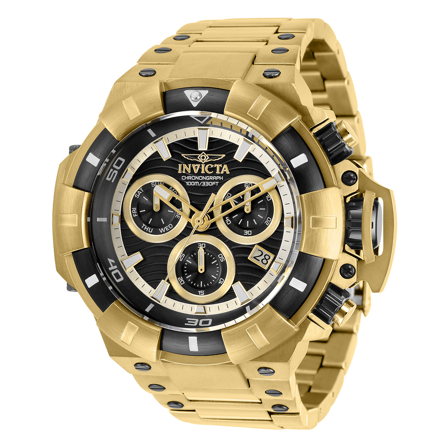 Gold-tone stainless steel case with a two-tone (black and gold-tone) stainless steel bracelet. Fixed black and gold and silver stainless steel bezel. Black dial with gold-tone hands and index-Arabic numeral hour markers. Minute markers around the outer rim. Dial Type: Analog. Luminescent hands and markers. Date display at the 4 o'clock position. Three sub-dials displaying: day, 60 second and 30 minute. Ronda Caliber Z60 FE quartz movement. Scratch resistant Flame Fusion crystal. Pull / push crown. Solid case back. Round case shape, case size: 52.5 mm, case thickness: 11 mm. Band width: 30 mm, band length: 8.25 inches. Fold over clasp. Water resistant at 100 meters / 330 feet. Functions: chronograph, date, day, hour, minute, second. Akula Series.
