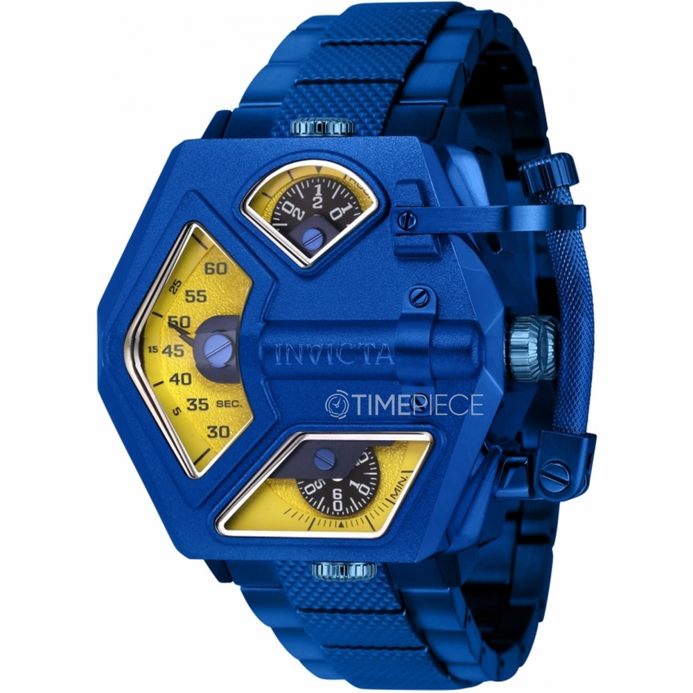 Blue stainless steel case and bracelet. Fixed blue stainless steel bezel. Yellow dial with Arabic numeral hour markers. Dial Type: Analog. P2650-SS, 763 quartz movement. Scratch resistant Flame Fusion crystal. Pull / push crown. Solid case back. Unique case shape, case size: 48 mm, case thickness: 26 mm. Band width: 26 mm, band length: 8.75 inches. Fold over clasp. Water resistant at 50 meters / 165 feet. Functions: hour, minute, second. Akula Series. Casual watch style. Invicta Akula Quartz Mens Watch 39936.