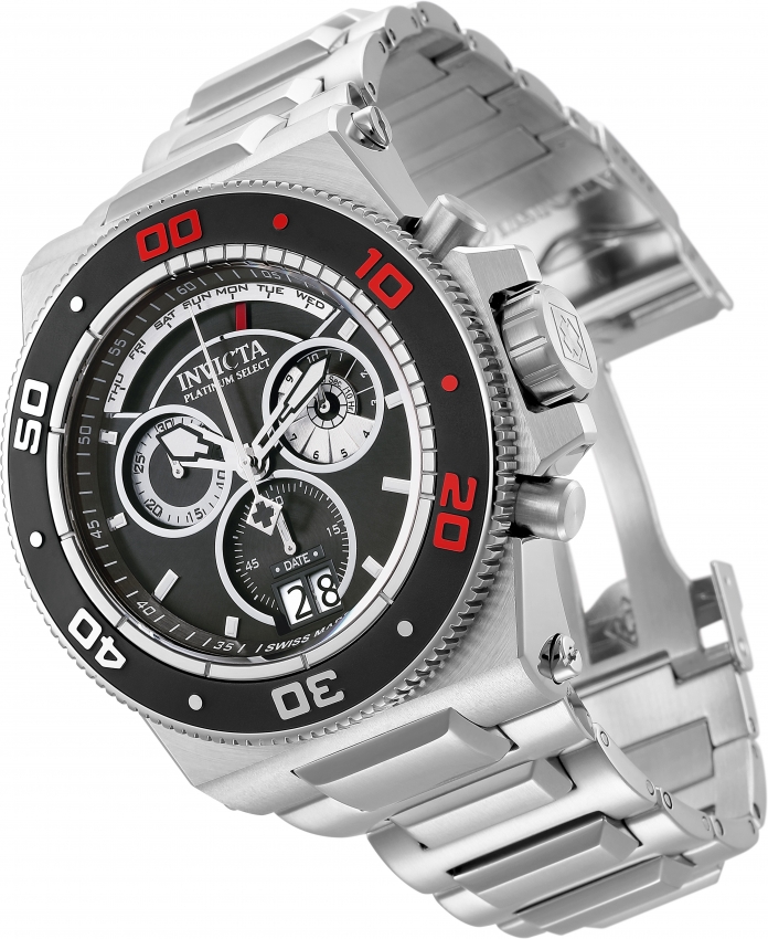 Stainless steel case with a stainless steel bracelet. Uni-directional rotating stainless steel bezel with a black aluminium ring. Black dial with luminous silver-tone hands and index hour markers. Minute markers around the outer rim. Dial Type: Analog. Luminescent hands. Date display at the 6 o'clock position. Day of the week display centered on the 12 o'clock position. Chronograph - three sub-dials displaying: 60 second, 30 minute and 1/10th of a second. Ronda caliber 8040.N quartz movement. Scratch resistant sapphire crystal. Screw down crown. Solid case back. Round case shape. Case size: 55.7 mm. Case thickness: 16 mm. Band width: 32 mm. Band length: 8.5 inches. Fold over clasp. Water resistant at 300 meters / 1000 feet. Functions: chronograph, retrograde, big date, day, hour, minute, small second. Dive watch style. Watch label: Swiss Made. Invicta Akula Chronograph Black Dial Stainless Steel Mens Watch 26047.