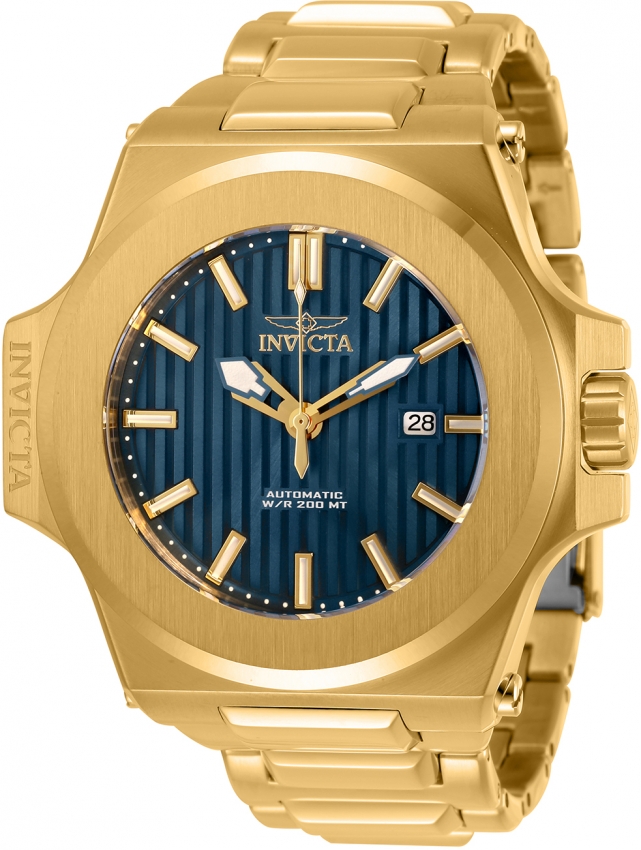 Yellow gold-tone stainless steel case and bracelet. Fixed yellow gold-tone bezel. Blue dial with luminous yellow gold-tone hands and index hour markers. Minute markers around the outer rim. Dial Type: Analog. Luminescent hands and markers. Date display at the 3 o'clock position. SII caliber NH35A automatic movement, containing 24 Jewels, bitting at 21600 vph, and has a power reserve of approximately 41 hours. Scratch resistant mineral crystal. Screw down crown. Transparent case back. Round case shape. Case size: 58 mm. Case thickness: 15.5 mm. Band width: 32 mm. Band length: 8.25 inches. Fold over clasp. Water resistant at 200 meters / 660 feet. Functions: date, hour, minute, second. Akula Series. Casual watch style. Watch label: Japan Movt. Invicta Akula Automatic Blue Dial Yellow Gold-tone Mens Watch 30135.