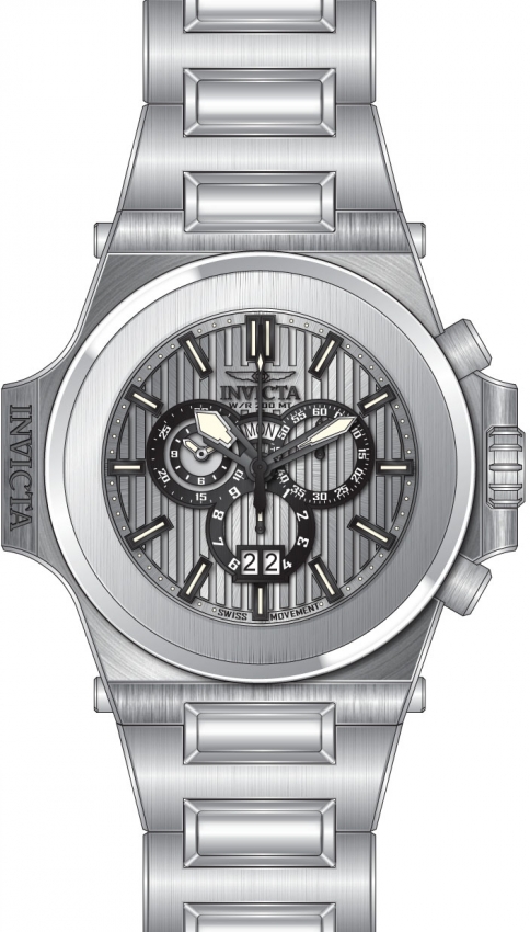 Stainless steel case with a stainless steel bracelet. Fixed stainless steel bezel. Silver dial with luminous grey gunmetal hands and index hour markers. Minute markers around the outer rim. Dial Type: Analog. Luminescent hands and markers. Big date display above the 6 o'clock position. Day of the week display mid-dial. Chronograph - three sub-dials displaying: 60 second, dual 12 hour/30 minute and 1/10th of a second. Ronda caliber 5050.C quartz movement. Scratch resistant Flame Fusion crystal. Screw down crown. Solid case back. Round case shape. Case size: 58 mm. Case thickness: 15.5 mm. Band width: 32 mm. Band length: 8.25 inches. Fold over clasp with a safety release. Water resistant at 200 meters / 660 feet. Functions: chronograph, big date, day, hour, minute, small second. Akula Series. Sport watch style. Watch label: Swiss Movt. Invicta Akula Chronograph Quartz Silver Dial Mens Watch 31672.