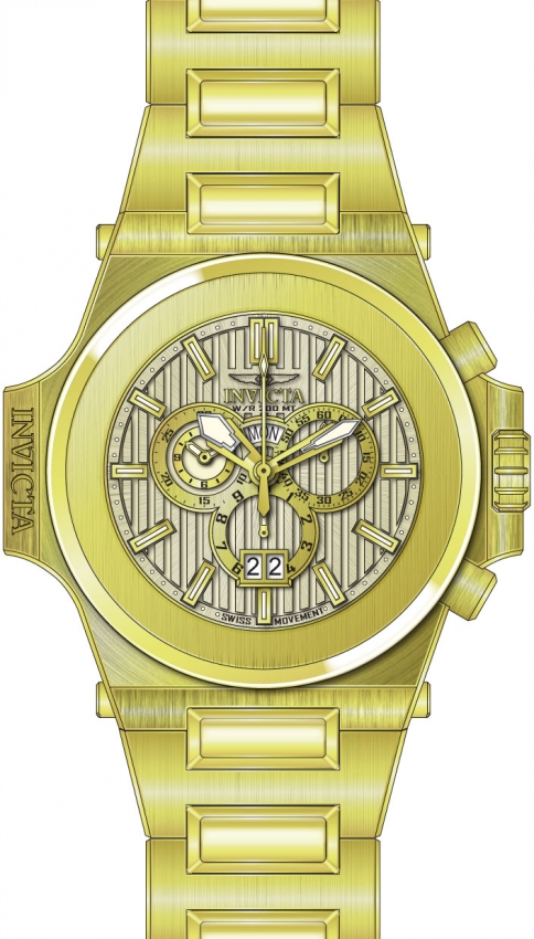 Gold-tone stainless steel case with a gold-tone stainless steel bracelet. Fixed gold-tone stainless steel bezel. Champagne dial with gold-tone hands and index hour markers. Minute markers around the outer rim. Dial Type: Analog. Luminescent hands and markers. Date display at the 6 o'clock position. Chronograph - three sub-dials displaying: 60 second, dual 12 hour / 30 minute and 1/10th of a second. Ronda Caliber 5050.C quartz movement. Scratch resistant flame fusion crystal. Screw down crown. Solid case back. Round case shape, case size: 58 mm, case thickness: 15.5 mm. Band width: 32 mm, band length: 8.25 inches. Fold over clasp. Water resistant at 200 meters / 660 feet. Functions: chronograph, big date, day, hour, minute, small second. Akula Series. Sport watch style. Watch label: Swiss Movt. Invicta Akula Chronograph Quartz Champagne Dial Mens Watch 31676.