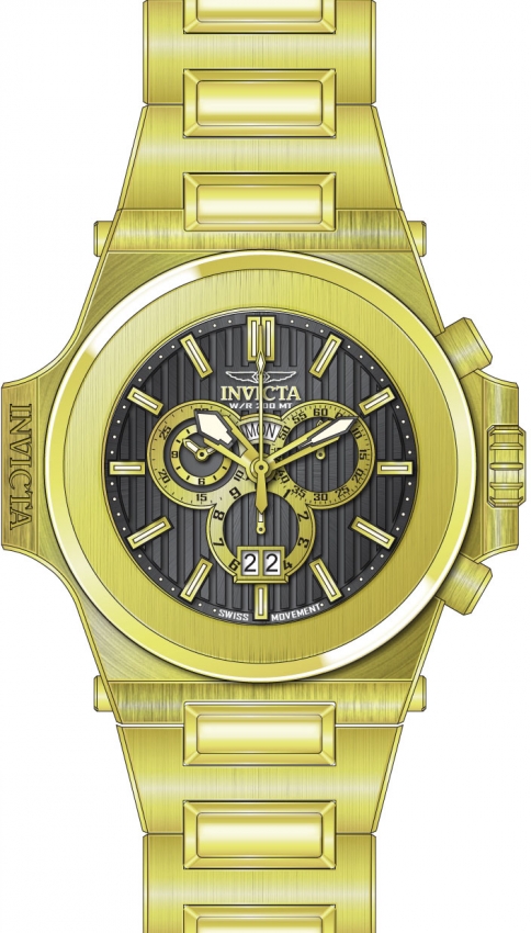 Gold-tone stainless steel case with a gold-tone stainless steel bracelet. Fixed gold-tone stainless steel bezel. Gunmetal dial with gold-tone hands and index hour markers. Minute markers around the outer rim. Dial Type: Analog. Luminescent hands and markers. Date display at the 6 o'clock position. Chronograph - three sub-dials displaying: 60 second, dual 12 hour / 30 minute and 1/10th of a second. Ronda Caliber 5050.C quartz movement. Scratch resistant flame fusion crystal. Screw down crown. Solid case back. Round case shape, case size: 58 mm, case thickness: 15.5 mm. Band width: 32 mm, band length: 8.25 inches. Fold over clasp. Water resistant at 200 meters / 660 feet. Functions: chronograph, big date, day, hour, minute, small second. Akula Series. Sport watch style. Watch label: Swiss Movt. Invicta Akula Chronograph Quartz Gunmetal Dial Mens Watch 31677.
