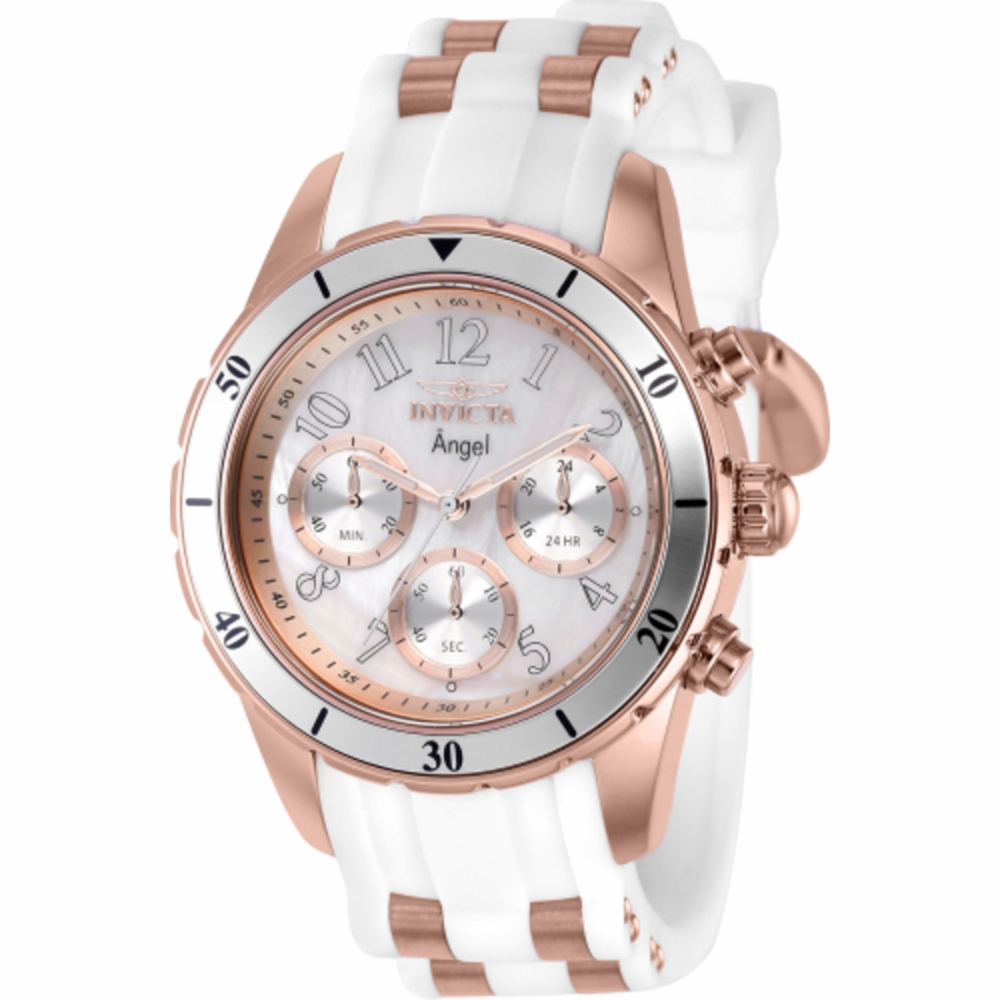 Rose gold-tone stainless steel case with a two-tone (white and rose gold) silicone and stainless steel strap. Fixed rose gold and silver aluminum and stainless steel bezel. White dial with rose gold-tone hands and Arabic numeral hour markers. Minute markers around the outer rim. Dial Type: Analog. Luminescent hands. Chronograph - three sub-dials displaying: 60 second, 60 minute and 24 hour. Hattori Caliber VD54 quartz movement. Scratch resistant Flame Fusion crystal. Pull / push crown. Solid case back. Round case shape, case size: 40 mm, case thickness: 11.5 mm. Band width: 20 mm, band length: 7.50 inches. Buckle clasp. Water resistant at 100 meters / 330 feet. Functions: chronograph, GMT, second time zone, hour, minute, second. Angel Series. Casual watch style. Watch label: Japan Movt. Invicta Angel Chronograph Quartz White Dial Ladies Watch 38755.