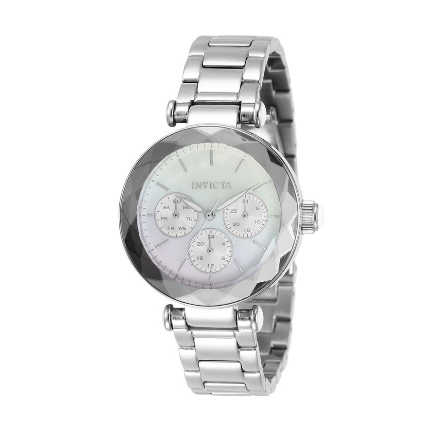 Silver-tone stainless steel case and bracelet. Fixed silver-tone stainless steel bezel. Mother of pearl dial with silver-tone hands and index hour markers. Minute markers around the outer rim. Dial Type: Analog. Date display at the 3 o'clock position. Three sub-dials displaying: date, day and 24 hour. TMI Caliber VH63 quartz movement. Scratch resistant Flame Fusion crystal. Pull / push crown. Solid case back. Round case shape, case size: 37 mm, case thickness: 9 mm. Band width: 16 mm, band length: 7 inches. Fold over clasp. Water resistant at 100 meters / 330 feet. Functions: date, day, GMT, second time zone, hour, minute, second. Angel Series. Casual watch style. Watch label: Japan Movt. Invicta Angel GMT Mother of Pearl Dial Unisex Watch 31267.
