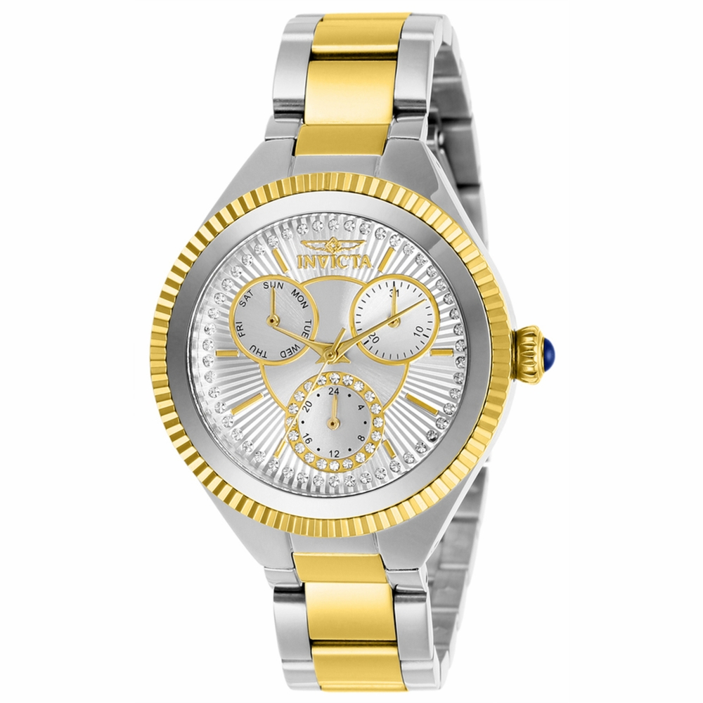 Gold-tone stainless steel case with a two-tone (silver-tone and gold-tone) stainless steel bracelet. Fixed gold and silver stainless steel bezel. Silver-tone dial with gold-tone hands and index hour markers. Crystal markers around the outer rim. Dial Type: Analog. Date display at the 2 o'clock position. Three sub-dials displaying: date, day and 24 hour. Caliber VH68 quartz movement. Scratch resistant Flame Fusion crystal. Pull / push crown. Solid case back. Round case shape, case size: 36 mm, case thickness: 11 mm. Band width: 16 mm, band length: 7.25 inches. Fold over clasp. Water resistant at 100 meters / 330 feet. Functions: date, day, GMT, second time zone, hour, minute, second. Angel Series. Casual watch style. Invicta Angel GMT Silver-tone Dial Unisex Watch 28350.