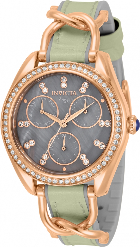 Rose gold-tone stainless steel case with a green (grey backed) leather strap with rose gold-tone d-links. Fixed rose gold-tone bezel set with crystals. Grey dial with rose gold-tone leaf-style hands and crystal hour markers. Dial Type: Analog. Three multi-function sub-dials displaying: date, day of the week and 24 hour. Caliber VH68 quartz movement. Scratch resistant Flame Fusion crystal. Pull / push cabochon-set crown. Solid case back. Round case shape. Case size: 36 mm. Case thickness: 11 mm. Band width: 17 mm. Band length: 7.50 inches. Tang clasp. Water resistant at 100 meters / 330 feet. Functions: date, day, GMT, second time zone, hour, minute, second. Angel Series. Dress watch style. Watch label: Japan Movt. Invicta Angel Quartz Crystal Grey Dial Green Leather Ladies Watch 31203.