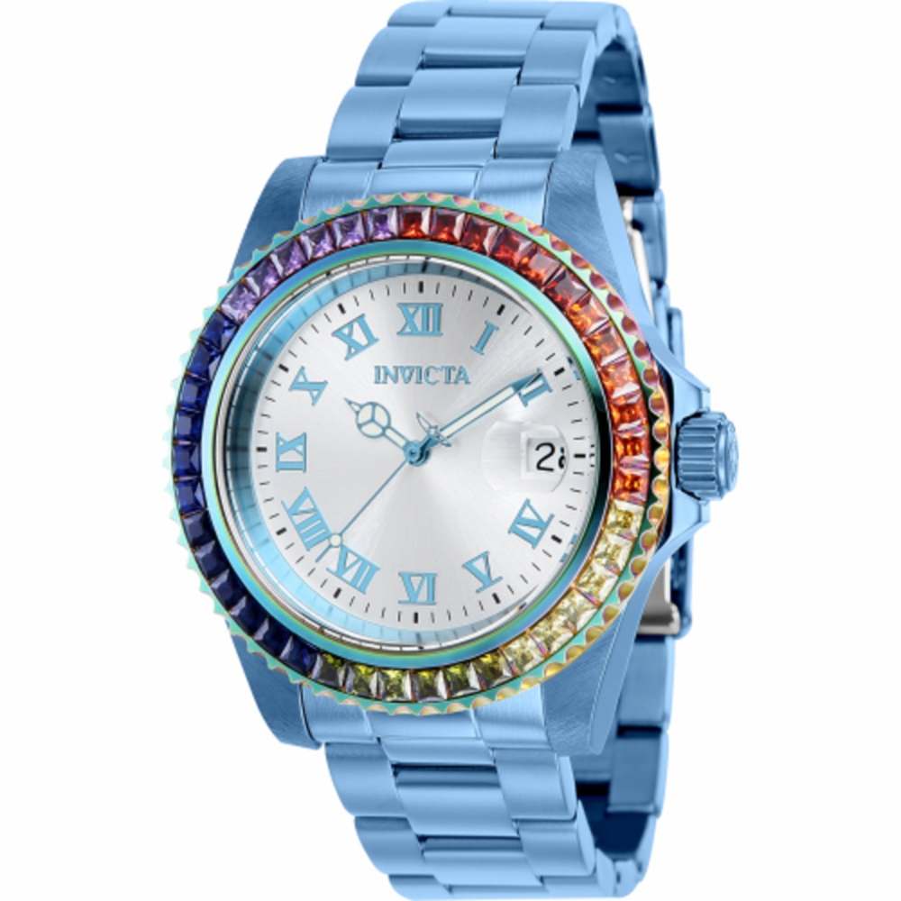 Ice blue and iridescent stainless steel case with a blue stainless steel bracelet. Crystal set bezel. Silver-tone dial with blue Mercedes-logo and Breguet-style shape hands and Roman numeral hour markers. Minute markers around the outer rim. Dial Type: Analog. Luminescent hands. Date display at the 3 o'clock position. Ronda Caliber 515 quartz movement. Scratch resistant mineral crystal. Pull / push crown. Solid case back. Round case shape, case size: 40 mm, case thickness: 12.5 mm. Band width: 20 mm, band length: 7.75 inches. Fold over clasp. Water resistant at 200 meters / 660 feet. Functions: date, hour, minute, second. Angel Series. Casual watch style. Watch label: Swiss Movt. Invicta Angel Quartz Crystal Silver Dial Ladies Watch 40233.