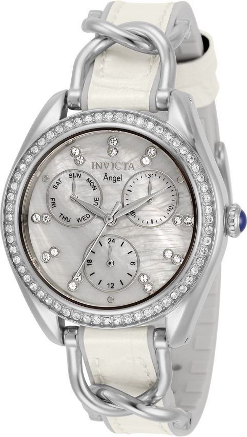 Stainless steel case with a white leather strap with stainless steel d-links. Fixed stainless steel bezel set with crystals. White dial with silver-tone leaf-style hands and crystal hour markers. Dial Type: Analog. Three multi-function sub-dials displaying: date, day of the week and 24 hour. Caliber VH68 quartz movement. Scratch resistant Flame Fusion crystal. Push / pull cabochon-set crown. Solid case back. Round case shape. Case size: 36 mm. Case thickness: 11 mm. Band width: 17 mm. Band length: 7.50 inches. Tang clasp. Water resistant at 100 meters / 330 feet. Functions: date, day, GMT, second time zone, hour, minute, second. Angel Series. Dress watch style. Watch label: Japan Movt. Invicta Angel Quartz Crystal White Dial Ladies Watch 31205.