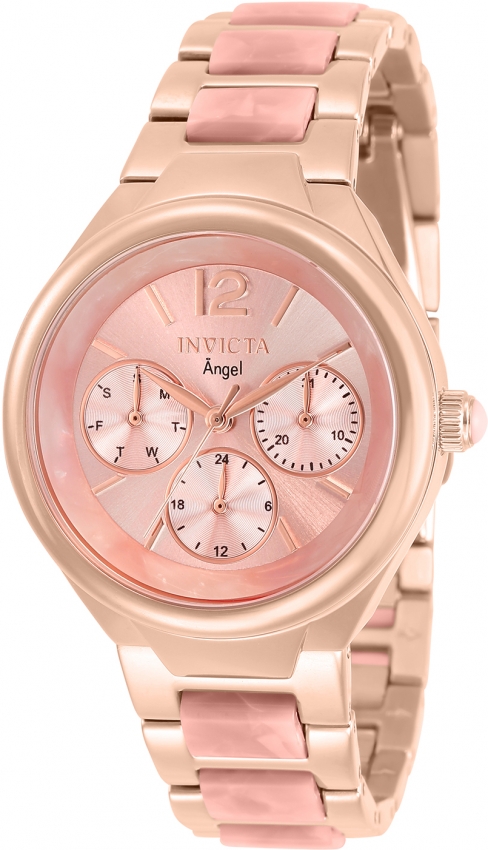 Rose gold-tone stainless steel case with a rose gold and pink stainless steel and resin strap. Fixed rose gold-tone stainless steel bezel. Pink dial with rose gold-tone hands and index-Arabic numeral hour markers. Dial Type: Analog. Date display at the 3 o'clock position. Three sub-dials displaying: date, day and 24 hour. TMI Caliber VH63 quartz movement. Scratch resistant Flame Fusion crystal. Pull / push crown. Solid case back. Round case shape, case size: 35 mm, case thickness: 10 mm. Band width: 19 mm, band length: 7.25 inches. Fold over clasp. Water resistant at 100 meters / 330 feet. Functions: date, day, GMT, second time zone, hour, minute, second. Angel Series. Casual watch style. Watch label: Japan Movt. Invicta Angel Quartz Pink Dial Ladies Watch 32080.
