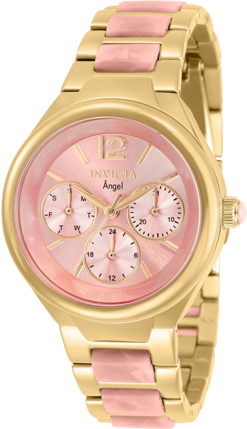 Gold-tone stainless steel case with a gold and pink stainless steel and resin strap. Fixed gold-tone stainless steel bezel. Pink dial with gold-tone hands and index-Arabic numeral hour markers. Dial Type: Analog. Date display at the 3 o'clock position. Three sub-dials displaying: date, day and 24 hour. TMI Caliber VH63 quartz movement. Scratch resistant Flame Fusion crystal. Pull / push crown. Solid case back. Round case shape, case size: 35 mm, case thickness: 10 mm. Band width: 19 mm, band length: 7.25 inches. Fold over clasp. Water resistant at 100 meters / 330 feet. Functions: date, day, GMT, second time zone, hour, minute, second. Angel Series. Casual watch style. Watch label: Japan Movt. Invicta Angel Quartz Pink Dial Ladies Watch 32081.