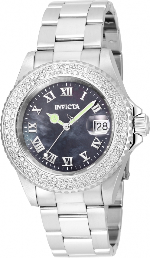 Silver-tone stainless steel case with a silver-tone stainless steel bracelet. Fixed silver-tone stainless steel bezel. Black mother of pearl dial with silver-tone hands and Roman numeral hour markers. Minute markers around the outer rim. Dial Type: Analog. Luminescent hands. Date display at the o'clock position. Ronda Caliber 515 quartz movement. Scratch resistant mineral crystal. Screw down crown. Solid case back. Round case shape. Case size: 40 mm. Band width: 20 mm. Fold over clasp. Water resistant at 200 meters / 660 feet. Functions: date, hour, minute, second. Dress watch style. Watch label: Swiss Movt. Invicta Angel Black Mother of Pearl Dial Ladies Watch 21711.
