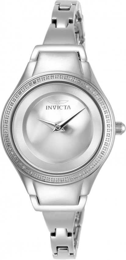 Stainless steel case with a stainless steel bangle bracelet. Fixed stainless steel bezel set with crystals. Silver dial with silver-tone hands. No markers. Dial Type: Analog. Hattori Caliber PC10 quartz movement. Scratch resistant flame fusion crystal. Pull / push crown. Solid case back. Round case shape. Case size: 29.5 mm. Case thickness: 10 mm. Band width: 15 mm. Jewelry clasp. Water resistant at 100 meters / 330 feet. Functions: hour, minute. Dress watch style. Watch label: Japan Movt. Invicta Angel Crystal Silver Dial Ladies Watch 26765.