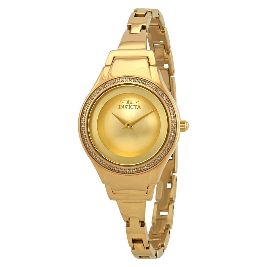 Gold-tone stainless steel case with a gold-tone stainless steel bracelet. Fixed gold-tone diamond set bezel. Gold-tone dial with gold-tone hands. Dial Type: Analog. Hattori Caliber PC10 quartz movement. Scratch resistant flame fusion crystal. Pull / push crown. Solid case back. Round case shape. Case size: 29.5 mm. Band width: 15 mm. Jewelry clasp. Water resistant at 100 meters / 330 feet. Functions: hour, minute. Dress watch style. Watch label: Japan Movt. Invicta Angel Diamond Gold Dial Ladies Watch 26766.