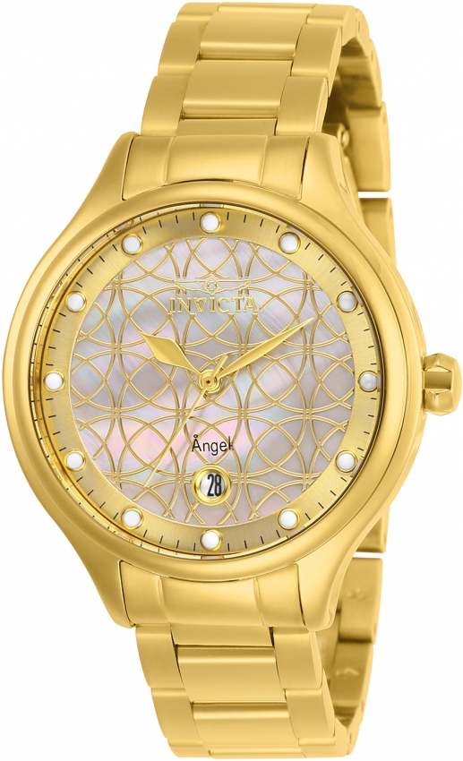 Yellow gold-tone stainless steel case and bracelet. Fixed yellow gold-tone bezel. Mother of pearl (cell pattern) dial with yellow gold-tone hands and index hour markers. Minute markers around the outer rim. Dial Type: Analog. Luminescent hands and markers. Date display above the 6 o'clock position. Hattori caliber PC32 quartz movement. Scratch resistant flame fusion crystal. Pull / push crown. Solid case back. Round case shape. Case size: 38 mm. Case thickness: 11 mm. Band width: 16 mm. Fold over clasp with a push button release. Water resistant at 100 meters / 330 feet. Functions: date, hour, minute, second. Angel Series. Casual watch style. Watch label: Japan Movt. Invicta Angel Mother of Pearl Dial Ladies Watch 27434.