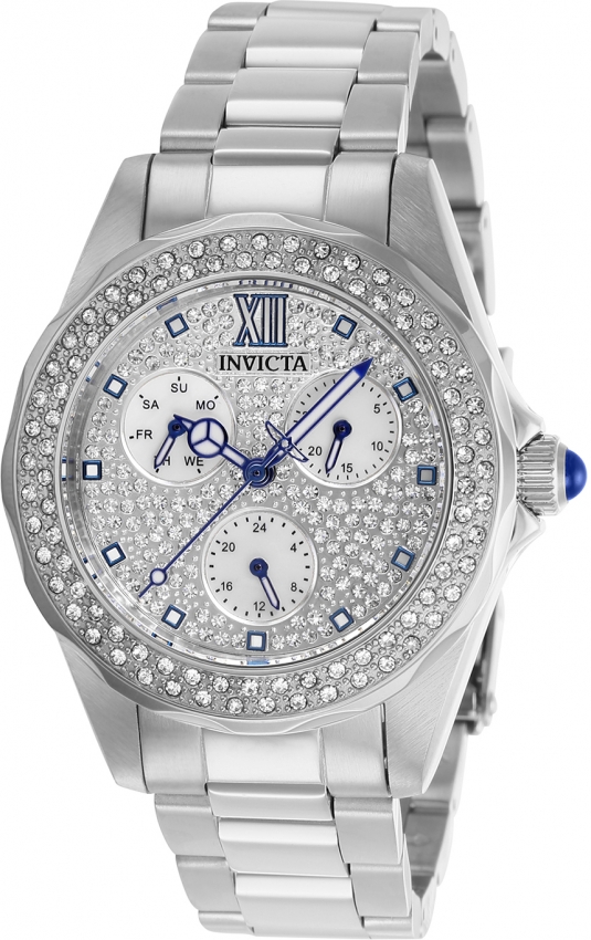 Silver-tone stainless steel case with a silver-tone stainless steel bracelet. Fixed silver-tone stainless steel bezel. White and pave dial with blue Mercedes-logo, sword, and Breguet-style shape hands and index hour markers. Dial Type: Analog. Luminescent hands and markers. Date display at the 2 o'clock position. Three - date, day and 24-hour subdials. Caliber VH68 quartz movement. Scratch resistant mineral crystal. Pull / push crown. Solid case back. Round case shape, case size: 38 mm, case thickness: 11.5 mm. Band width: 18 mm, band length: 7 inches. Fold over clasp. Water resistant at 100 meters / 330 feet. Functions: date, day, GMT, second time zone, hour, minute, second. Dress watch style. Watch label: Japan Movt. Invicta Angel Quartz Ladies Watch 28432.
