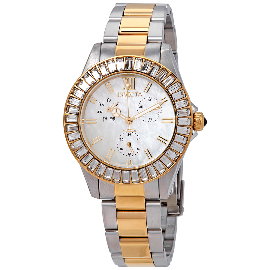 Stainless steel case with a two-tone (silver-tone and gold-tone) stainless steel bracelet. Fixed gold-tone bezel set with baguette crystals. Mother of pearl dial with luminous gold-tone hands and index hour markers. Roman numeral appears at the 12 o'clock position. Dial Type: Analog. Luminescent hands. Date display at the 2 o'clock position. Three sub-dials displaying: date, day of the week and 24-hour. Caliber VH68 quartz movement. Scratch resistant mineral crystal. Pull / push crown. Solid case back. Round case shape. Case size: 38 mm. Band width: 20 mm. Band length: 8 inches. Fold over clasp with a safety release. Water resistant at 100 meters / 330 feet. Functions: date, day, hour, minute, second. Dress watch style. Watch label: Japan Movt. Invicta Angel Crystal Mother of Pearl Dial Ladies Watch 28451.