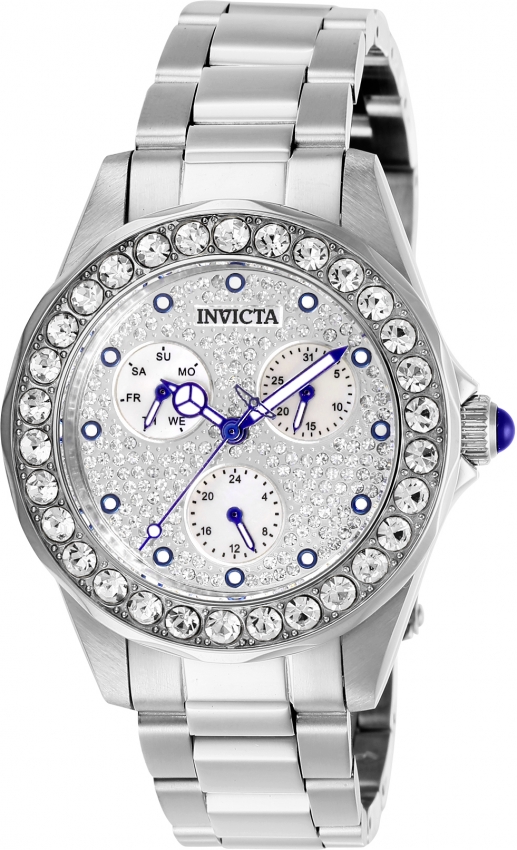 Stainless steel case with a stainless steel bracelet. Fixed stainless steel bezel set with crystals. Silver crystal pave dial with luminous blue hands and dot hour markers. Dial Type: Analog. Luminescent hands. Three multi-function sub-dials displaying: date, day of the week and 24 hour. Caliber VH68 quartz movement. Scratch resistant mineral crystal. Pull / push crown. Solid case back. Round case shape. Case size: 38 mm. Case thickness: 11.5 mm. Band width: 18 mm. Fold over clasp with a safety release. Water resistant at 100 meters / 330 feet. Functions: date, day, GMT, second time zone, hour, minute, second. Additional Info: 30 white size3.0 crystals. Angel Series. Dress watch style. Watch label: Japan Movt. Invicta Angel Crystal Silver Dial Ladies Watch 28457.
