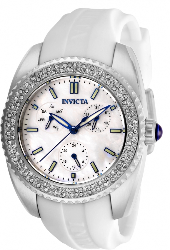 Stainless steel case with a white silicone strap. Fixed stainless steel bezel set with crystals. White mother of pearl dial with luminous blue hands and index hour markers. Minute markers around the outer rim. Dial Type: Analog. Luminescent hands and markers. Three multi-function sub-dials displaying: date, day of the week and 24 hour. Caliber VH68 quartz movement. Scratch resistant flame fusion crystal. Pull / push crown. Solid case back. Round case shape. Case size: 38 mm. Case thickness: 12.6 mm. Band width: 20 mm. Band length: 7.5 inches. Tang clasp. Water resistant at 100 meters / 330 feet. Functions: date, day, GMT, second time zone, hour, minute, second. Additional Info: 90 crystal. Angel Series. Dress watch style. Watch label: Japan Movt. Invicta Angel Crystal White Mother of Pearl Dial Ladies Watch 28486.