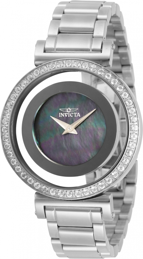 Silver-tone stainless steel case with a silver-tone stainless steel bracelet. Fixed silver-tone crystal set bezel. Black dial with silver-tone dauphine-style shape hands. Dial Type: Analog. ISA Caliber K62 quartz movement. Scratch resistant mineral crystal. Pull / push crown. Solid case back. Round case shape, case size: 38 mm, case thickness: 11.2 mm. Band width: 16 mm, band length: 7 inches. Butterfly clasp. Water resistant at 30 meters / 100 feet. Functions: hour, minute. Dress watch style. Invicta Angel Quartz Crystal Black Dial Ladies Watch 28495.