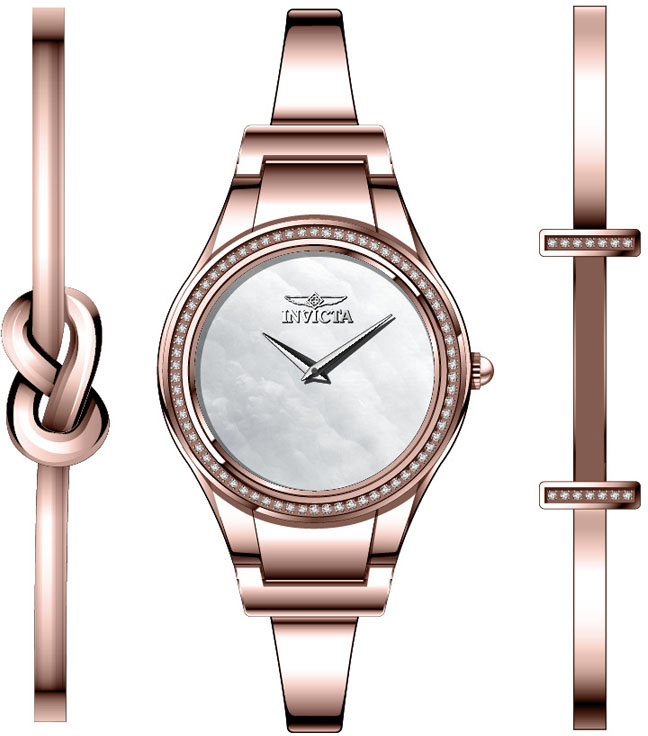 Rose gold-tone stainless steel case with a rose gold-tone stainless steel bracelet. Fixed rose gold-tone crystal set bezel. White mother of pearl dial with silver-tone hands. Dial Type: Analog. Hattori Caliber PC10 quartz movement. Scratch resistant flame fusion crystal. Pull / push crown. Solid case back. Round case shape, case size: 29.5 mm, case thickness: 8 mm. Band width: 15 mm, band length: 7.5 inches. Jewelry clasp. Water resistant at 100 meters / 330 feet. Functions: hour, minute. Dress watch style. Watch label: Japan Movt. Invicta Angel Crystal White Mother of Pearl Dial Ladies Watch 28506.