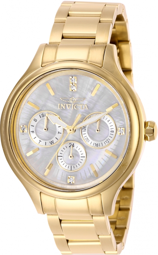 Gold-tone stainless steel case with a gold-tone stainless steel bracelet. Fixed gold-tone stainless steel bezel. White mother of pearl dial with gold-tone hands and crystal and index hour markers. Minute markers around the outer rim. Dial Type: Analog. Luminescent hands. Date display at the 3 o'clock position. Three - 24 hour, date and day of the week subdials. TMI Caliber VH63 quartz movement. Scratch resistant flame fusion crystal. Pull / push crown. Solid case back. Round case shape, case size: 38 mm, case thickness: 12 mm. Band width: 18 mm, band length: 6.50 inches. Fold over clasp. Water resistant at 100 meters / 330 feet. Functions: date, day, GMT, second time zone, hour, minute, second. Dress watch style. Watch label: Japan Movt. Invicta Angel Quartz Crystal White Mother of Pearl Dial Ladies Watch 28654.