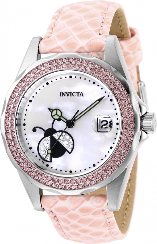 Silver-tone stainless steel case with a pink leather strap. Fixed silver-tone crystal set bezel. White dial with Mercedes-logo, sword, and Breguet-style shape hands and index hour markers. Minute markers around the outer rim. Dial Type: Analog. Luminescent hands. Date display at the 3 o'clock position. Hattori Caliber PC32A quartz movement. Scratch resistant mineral crystal. Pull / push crown. Solid case back. Round case shape, case size: 38 mm, case thickness: 12 mm. Band width: 18 mm, band length: 7.75 inches. Buckle clasp. Water resistant at 100 meters / 330 feet. Functions: date, hour, minute, second. Dress watch style. Watch label: Japan Movt. Invicta Angel Quartz Crystal White Dial Ladies Watch 29027.