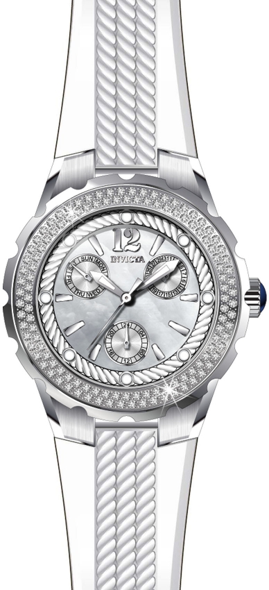 Stainless steel case with a white silicone strap. Fixed stainless steel bezel set with crystals. White dial with luminous silver-tone sword-shaped hands and index hour markers. An Arabic numeral appears at the 12 o'clock position. Dial Type: Analog. Luminescent hands and markers. Three sub-dials displaying: date, day of the week and 24 hour. Caliber VH68 quartz movement. Scratch resistant flame fusion crystal. Pull / push crown. Solid case back. Round case shape. Case size: 38 mm. Case thickness: 11 mm. Band width: 22 mm. Band length: 8 inches. Tang clasp. Water resistant at 100 meters / 330 feet. Functions: date, day, GMT, second time zone, hour, minute, second. Angel Series. Dress watch style. Watch label: Japan Movt. Invicta Angel Quartz Crystal White Dial Ladies Watch 29084.