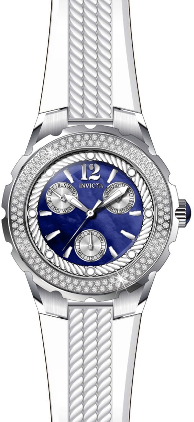 Stainless steel case with a white silicone strap. Fixed stainless steel bezel set with crystals. Blue dial with luminous silver-tone hands and index hour markers. An Arabic numeral appears at the 12 o'clock position. Dial Type: Analog. Luminescent hands and markers. Three multi-function sub-dials displaying: date, day of the week and 24 hour. Caliber VH68 quartz movement. Scratch resistant flame fusion crystal. Pull / push crown. Solid case back. Round case shape. Case size: 38 mm. Case thickness: 11 mm. Band width: 22 mm. Band length: 8 inches. Tang clasp. Water resistant at 100 meters / 330 feet. Functions: date, day, GMT, second time zone, hour, minute, second. Angel Series. Dress watch style. Watch label: Japan Movt. Invicta Angel Crystal Blue Dial White Silicone Ladies Watch 29085.