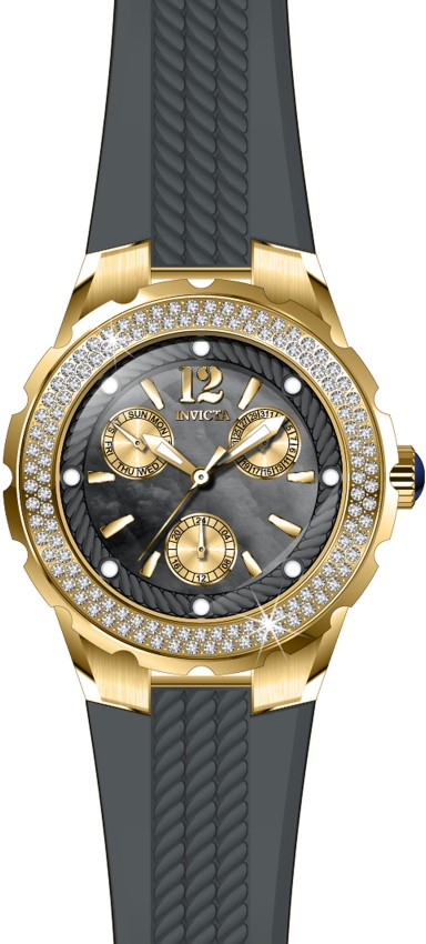 Yellow gold-tone stainless steel case with a gunmetal silicone strap. Fixed yellow gold-tone bezel set with crystals. Gunmetal dial with luminous yellow gold-tone sword-shaped hands and index hour markers. An Arabic numeral appears at the 12 o'clock position. Dial Type: Analog. Luminescent hands and markers. Three multi-function sub-dials displaying: date, day of the week and 24 hour. Caliber VH68 quartz movement. Scratch resistant flame fusion crystal. Pull / push crown. Solid case back. Round case shape. Case size: 38 mm. Case thickness: 11 mm. Band width: 22 mm. Band length: 8 inches. Tang clasp. Water resistant at 100 meters / 330 feet. Functions: date, day, GMT, second time zone, hour, minute, second. Angel Series. Dress watch style. Watch label: Japan Movt. Invicta Angel Quartz Crystal Gunmetal Dial Gunmetal Silicone Ladies Watch 29088.