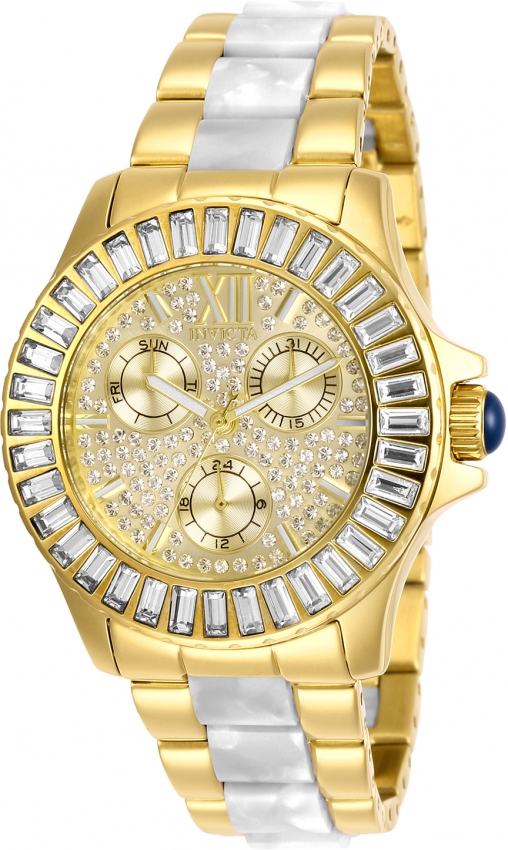 Gold-tone stainless steel case with a two-tone (gold-tone and white) stainless steel and tortoise bracelet. Fixed gold and white stainless steel and crystal bezel. White and gold dial with gold-tone hands and Roman numeral and index hour markers. Dial Type: Analog. Luminescent hands and markers. Date display at the 2 o'clock position. Three - date, day and 24-hour subdials. Caliber VH68 quartz movement. Scratch resistant flame fusion crystal. Pull / push crown. Solid case back. Round case shape, case size: 38 mm, case thickness: 12 mm. Band width: 20 mm, band length: 6.75 inches. Fold over clasp. Water resistant at 100 meters / 330 feet. Functions: date, day, GMT, second time zone, hour, minute, second. Dress watch style. Watch label: Japan Movt. Invicta Angel Quartz Crystal Ladies Watch 29104.