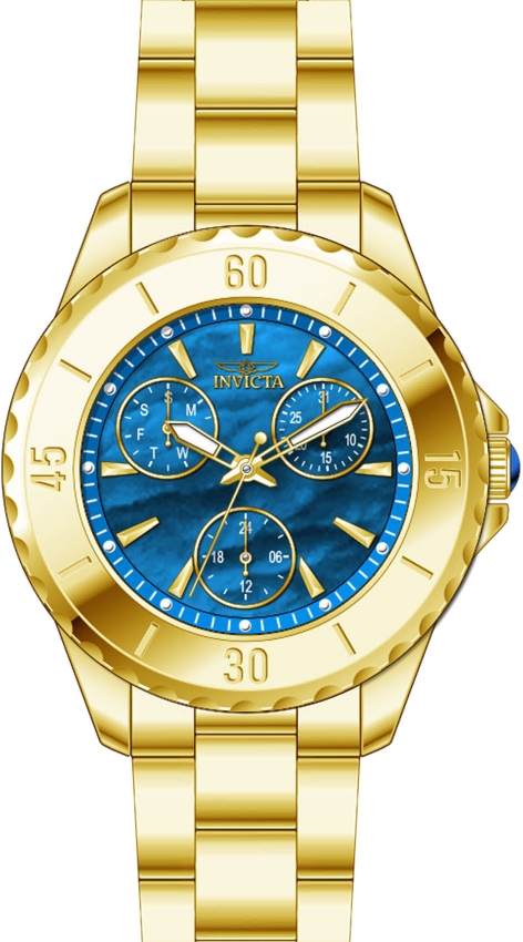 Yellow gold-tone stainless steel case and bracelet. Fixed yellow gold-tone bezel. Blue oyster dial with luminous yellow gold-tone skeleton sword-shaped hands and index hour markers. Minute markers around the outer rim. Dial Type: Analog. Luminescent hands. Three multi-function sub-dials displaying: date, day of the week and 24 hour. Caliber VH68 quartz movement. Scratch resistant flame fusion crystal. Pull / push crown. Solid case back. Round case shape. Case size: 38 mm. Case thickness: 11 mm. Band width: 18 mm. Band length: 7 inches. Fold over clasp. Water resistant at 100 meters / 330 feet. Functions: date, day, GMT, second time zone, hour, minute, second. Angel Series. Casual watch style. Watch label: Japan Movt. Invicta Angel Quartz Blue Dial Ladies Watch 29108.