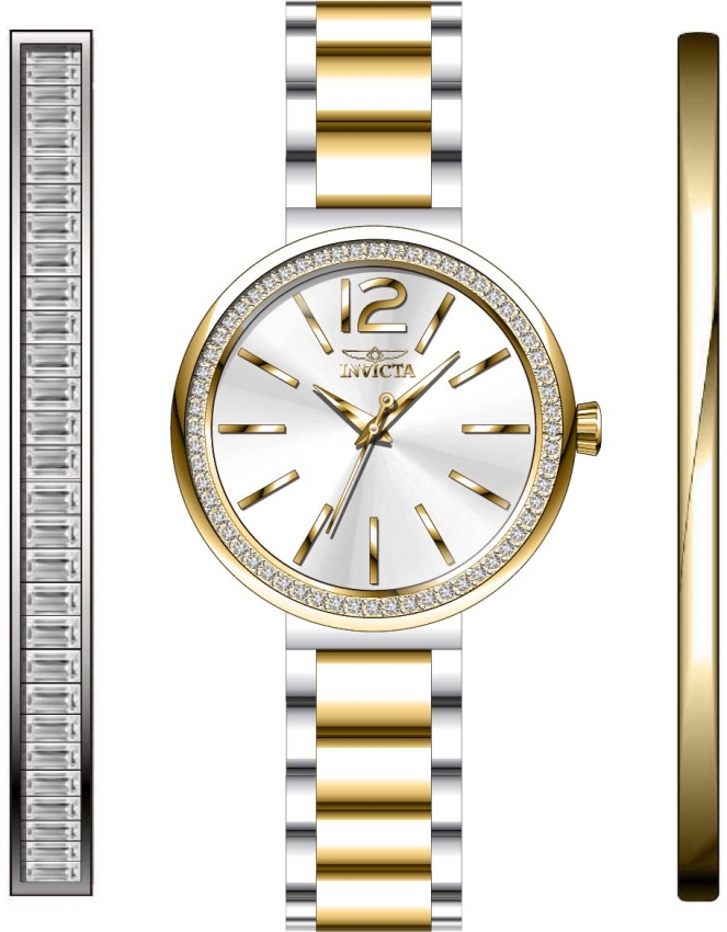 Silver-tone stainless steel case with a two-tone (silver-tone and gold-tone) stainless steel bracelet. Fixed gold-tone crystal set bezel. Silver-tone dial with gold-tone hands and Arabic numeral and index hour markers. Dial Type: Analog. Hattori Caliber PC21 quartz movement. Scratch resistant flame fusion crystal. Pull / push crown. Solid case back. Round case shape, case size: 30 mm, case thickness: 12 mm. Band width: 13 mm, band length: 7 inches. Fold over clasp. Water resistant at 100 meters / 330 feet. Functions: hour, minute, second. Dress watch style. Watch label: Japan Movt. Invicta Angel Quartz Crystal Silver Dial Ladies Watch 29273.