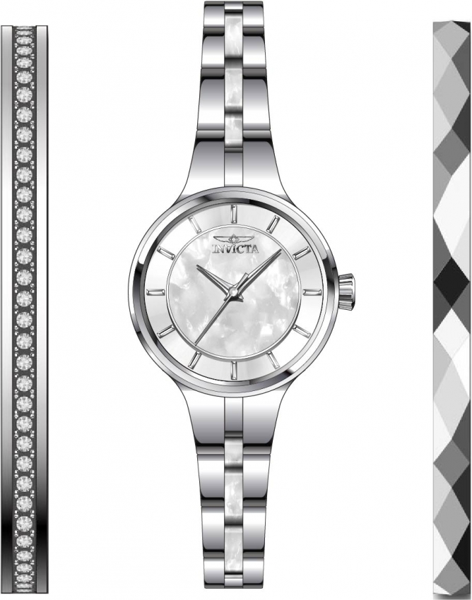 Silver-tone stainless steel case with a silver-tone stainless steel and tortoise bracelet. Fixed silver-tone stainless steel bezel. White mother of pearl dial with silver-tone hands and index hour markers. Dial Type: Analog. Hattori Caliber PC21 quartz movement. Scratch resistant flame fusion crystal. Pull / push crown. Solid case back. Round case shape, case size: 23 mm, case thickness: 8.5 mm. Band width: 8 mm, band length: 6.50 inches. Jewelry clasp. Water resistant at 100 meters / 330 feet. Functions: hour, minute, second. Casual watch style. Watch label: Japan Movt. Invicta Angel Quartz White Mother of Pearl Dial Ladies Watch 29277.