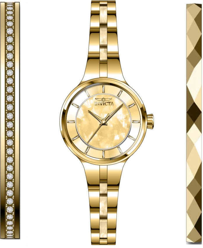 Yellow gold-tone stainless steel case with a two-tone (yellow gold-tone and rose gold-tone) stainless steel bracelet. Fixed yellow gold-tone bezel. Gold mother of pearl dial with yellow gold-tone dauphine-style hands and index hour markers. Dial Type: Analog. Hattori caliber PC21 quartz movement. Scratch resistant flame fusion crystal. Pull / push crown. Solid case back. Round case shape. Case size: 23 mm. Case thickness: 8.5 mm. Band width: 8 mm. Band length: 6.5 inches. Jewelry clasp. Water resistant at 100 meters / 330 feet. Functions: hour, minute, second. Additional Info: Set includes 2 bangle bracelets. Angel Series. Casual watch style. Watch label: Japan Movt. Invicta Angel Quartz Gold Dial Ladies Watch and Bangle Set 29278.
