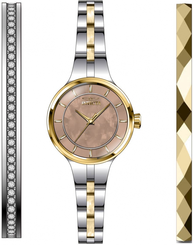 Stainless steel case with a two-tone (silver-tone and rose gold-tone) stainless steel bracelet. Fixed yellow gold-tone bezel. Brown mother of pearl dial with yellow gold-tone dauphine-style hands and index hour markers. Dial Type: Analog. Hattori caliber PC21 quartz movement. Scratch resistant flame fusion crystal. Pull / push crown. Solid case back. Round case shape. Case size: 23 mm. Case thickness: 8.5 mm. Band width: 8 mm. Band length: 6.5 inches. Jewelry clasp. Water resistant at 100 meters / 330 feet. Functions: hour, minute, second. Additional Info: set includes two bangle bracelets. Angel Series. Casual watch style. Watch label: Japan Movt. Invicta Angel Quartz Brown Mother of Pearl Dial Ladies Watch and Bracelet Set 29284