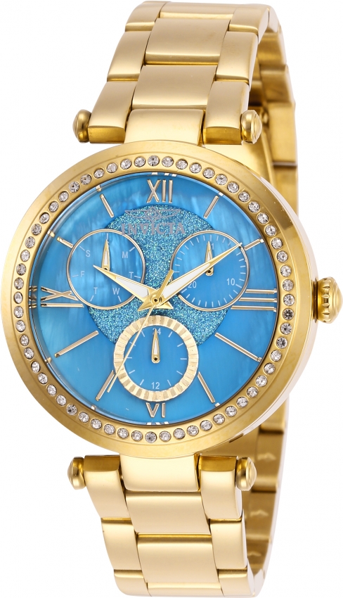 Gold-tone stainless steel case with a gold-tone stainless steel bracelet. Fixed gold-tone bezel with crystal set. Blue dial with gold-tone dauphine-style shape hands and Roman numeral and index hour markers. Dial Type: Analog. Luminescent hands. Date display at the 2 o'clock position. Three - date, day and 24-hour subdials. Caliber VH68 quartz movement. Scratch resistant flame fusion crystal. Pull / push crown. Solid case back. Round case shape, case size: 36 mm, case thickness: 11 mm. Band width: 18 mm, band length: 7 inches. Fold over clasp. Water resistant at 100 meters / 330 feet. Functions: date, day, GMT, second time zone, hour, minute, second. Angel Series. Dress watch style. Watch label: Japan Movt. Invicta Angel Quartz Crystal Blue Dial Ladies Watch 29297.
